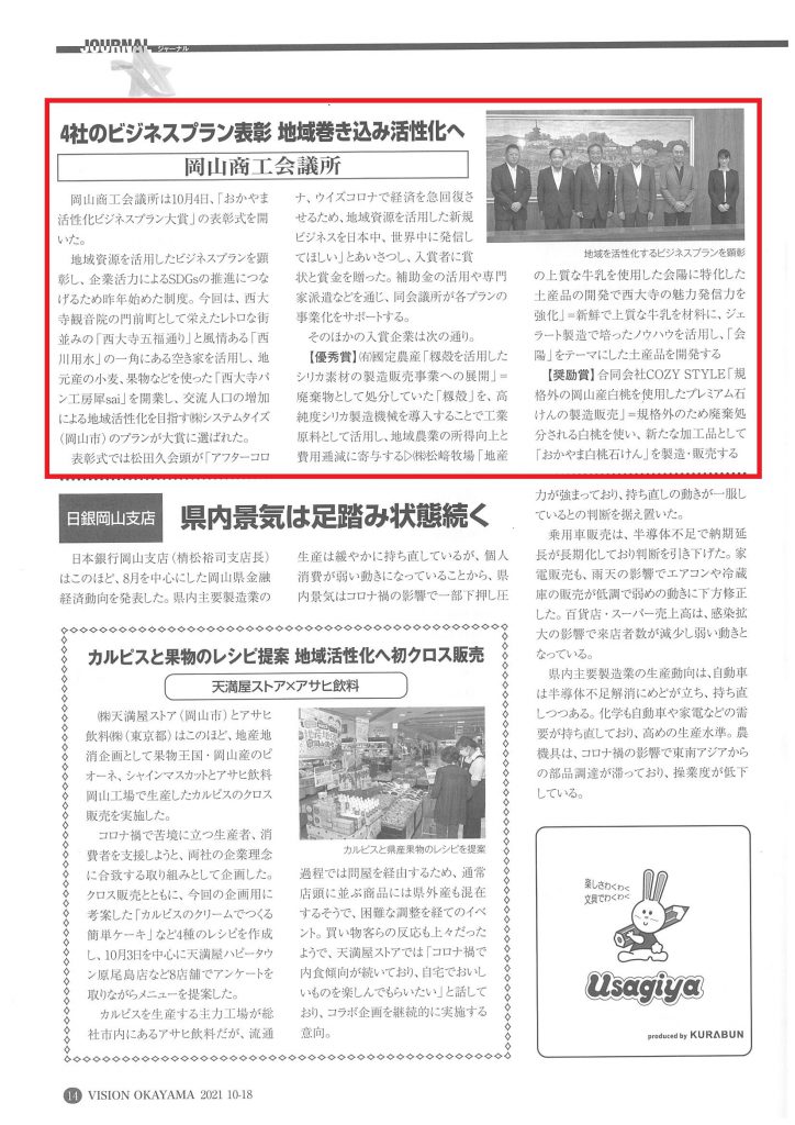 「おかやま活性化ビジネスプラン大賞」についての記事が掲載されました。